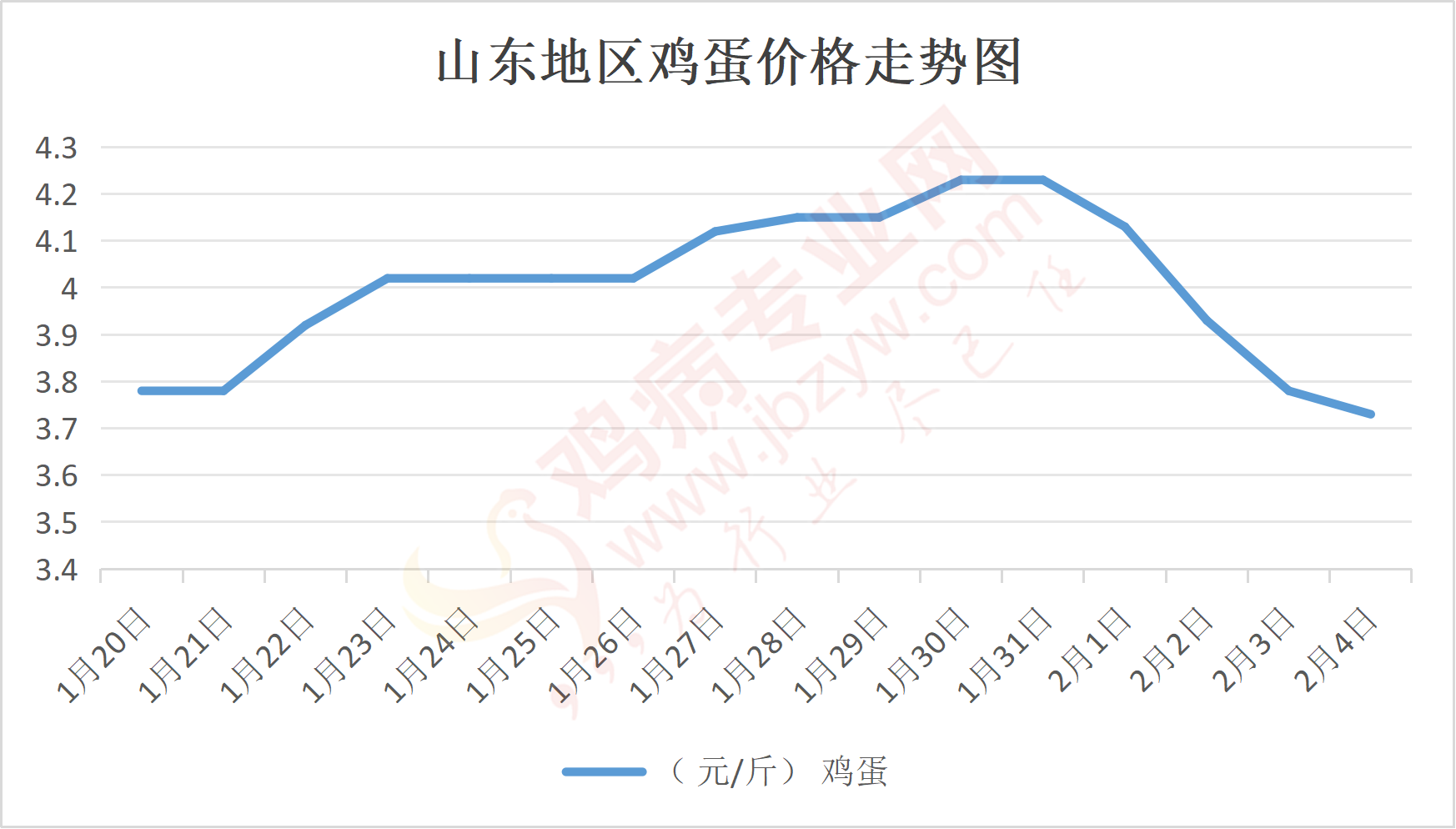 鸡病专业网消息:2月4日,山东地区莱阳鸡蛋3.75元/斤,落;青岛鸡蛋3.75元/斤,落;诸城鸡蛋3.8元/斤,落;安丘鸡蛋3.7元/斤,落;昌乐鸡蛋3.7元/斤,落;寿光鸡蛋3.7元/斤,落;昌邑鸡蛋3.7元/斤,落;高密鸡蛋3.8元/斤,落;青州鸡蛋3.7元/斤,落;临朐鸡蛋3.7元/斤,落;莱州鸡蛋3.75元/斤,落;威海鸡蛋3.75元/斤,落;临沭鸡蛋3.65元/斤,落;沂水鸡蛋3.65元/斤,落;沂南鸡蛋3.65元/斤,落;莒南鸡蛋3.65元/斤,落;兰陵县鸡蛋3.65元/斤,落;日照鸡蛋3.65元/斤,落;莒县鸡蛋3.65元/斤,落;日照辛萁商贸鸡蛋3.65元/斤,落;泗水鸡蛋价格108元/30斤,落;济宁、汶上鸡蛋价格108元/30斤,落;梁山、东平红蛋价格108元/30斤,落;枣庄滕州地区鸡蛋混码主流到户110元/30斤,落;泰安地区新泰鸡蛋价格108元/30斤,落;菏泽地区曹县主流到户107元/30斤,落;成武鸡蛋价格107元/30斤,落;单县到户107元/30斤,落;聊城莘县107元/30斤,落;莱芜鸡蛋164元/45斤,落;济南鸡蛋164元/45斤,落;德州鸡蛋142元/40斤,落;滨州鸡蛋142元/40斤,落。