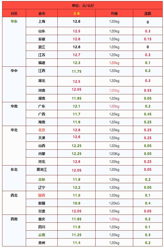| 华北 | 北 京 | 12.03 | 11.99 | 0.33% | 元/KG |
