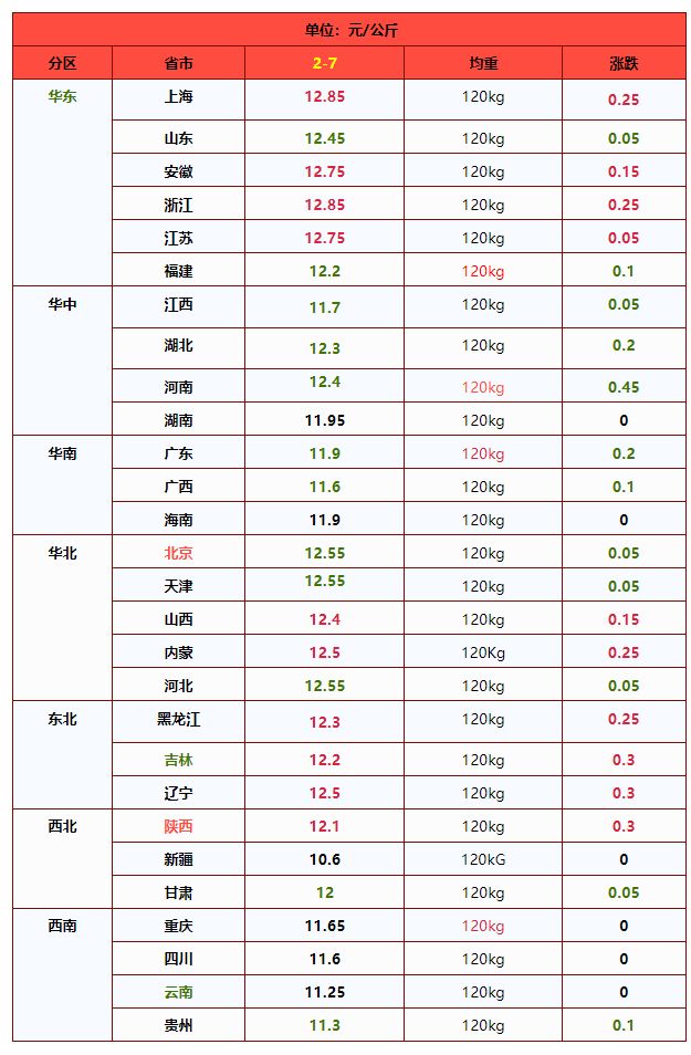 据数据分析,受屠宰场调价,预计,2月7日,外三元生猪出栏报价上涨0.03元,生猪均价在12.05元/公斤,市场以波动上涨为主,后市关注屠宰场开工率的变化以及头部猪企出栏节奏的变化!