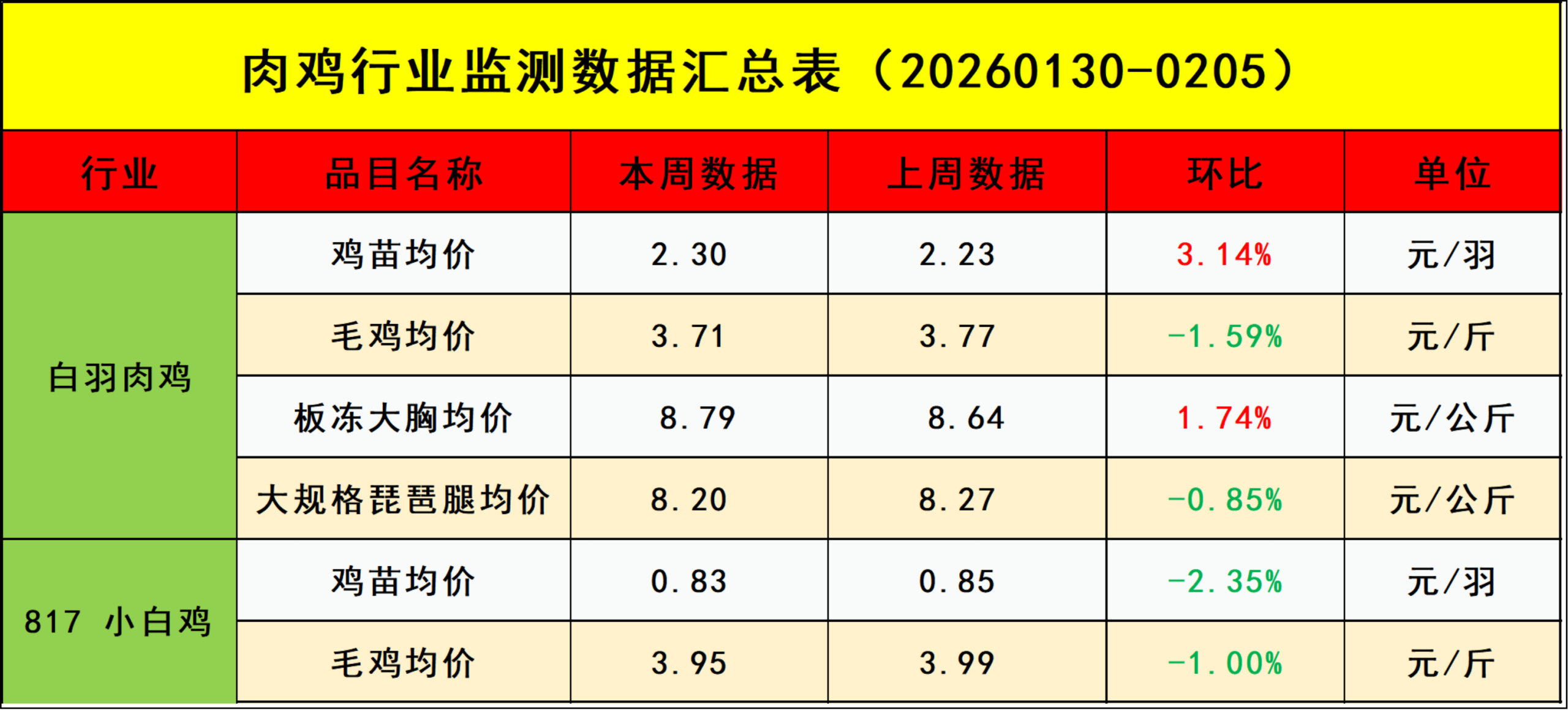 817小白鸡:短期产品走货速度不快,屠宰企业收购热情不高,养殖端面对下行行情出栏积极性提升,毛鸡价格反弹上行难度较大,预计下周毛鸡市场交投偏弱,毛鸡均价环比下跌。中旬市场逐渐进入春节假期,市场交投量减少,毛鸡价格或延续;节后市场供需两淡,毛鸡价格或延续偏弱震荡态势。(密切关注替代品价格以及气温变化)