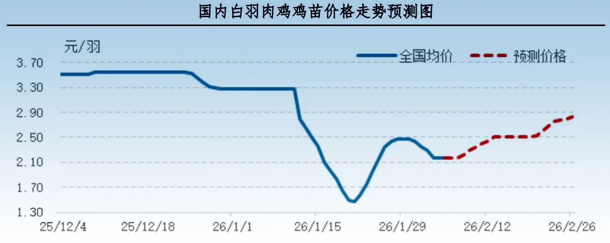 白羽肉鸡鸡苗:预计未来一周全国白羽肉鸡鸡苗价格或呈先稳后涨走势,周均价环比上涨。据相关机构调研发现,下周鸡苗供应量或继续增加,此时补栏鸡苗待毛鸡出栏时处于正月底,屠宰场多恢复正常开工,养殖户补栏积极性提升,孵化场计划顺畅,短期鸡苗主流成交价格或上涨。