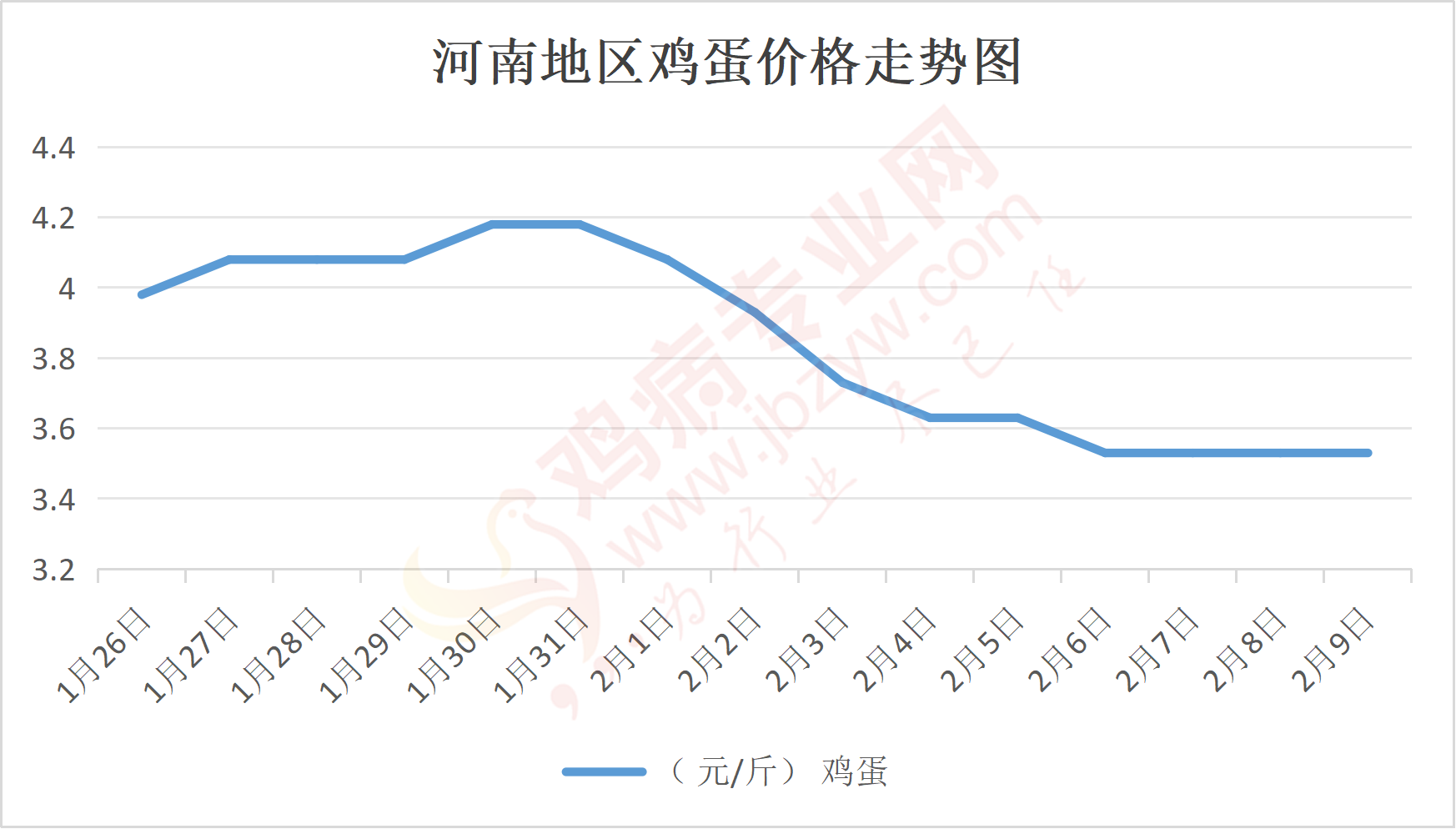 鸡病专业网消息:2月9日,河南郑州鸡蛋3.55元/斤,稳;新密鸡蛋3.55元/斤,稳;荥阳鸡蛋3.55元/斤,稳;中牟鸡蛋3.55元/斤,稳;周口鸡蛋3.5-3.55元/斤,稳;商丘鸡蛋105元/30斤,稳;鹤壁鸡蛋3.5-3.5元/斤,稳;汝州鸡蛋3.55元/斤,稳;开封鸡蛋105元/30斤,稳;漯河鸡蛋3.5-3.55元/斤,稳;漯河临颍鸡蛋3.55元/斤,稳;许昌鸡蛋3.5-3.55元/斤,稳;南阳鸡蛋3.55元/斤,稳;南阳邓州鸡蛋3.55元/斤,稳;新乡鸡蛋3.5元/斤,稳;安阳鸡蛋3.5元/斤,稳;新郑鸡蛋3.55元/斤,稳;登封鸡蛋3.55元/斤,稳;平顶山鸡蛋3.55元/斤,稳;驻马店鸡蛋3.55元/斤,稳;三门峡鸡蛋3.55元/斤,稳;焦作鸡蛋3.55元/斤,稳;信阳鸡蛋3.5-3.55元/斤,稳;濮阳鸡蛋3.5元/斤,稳。