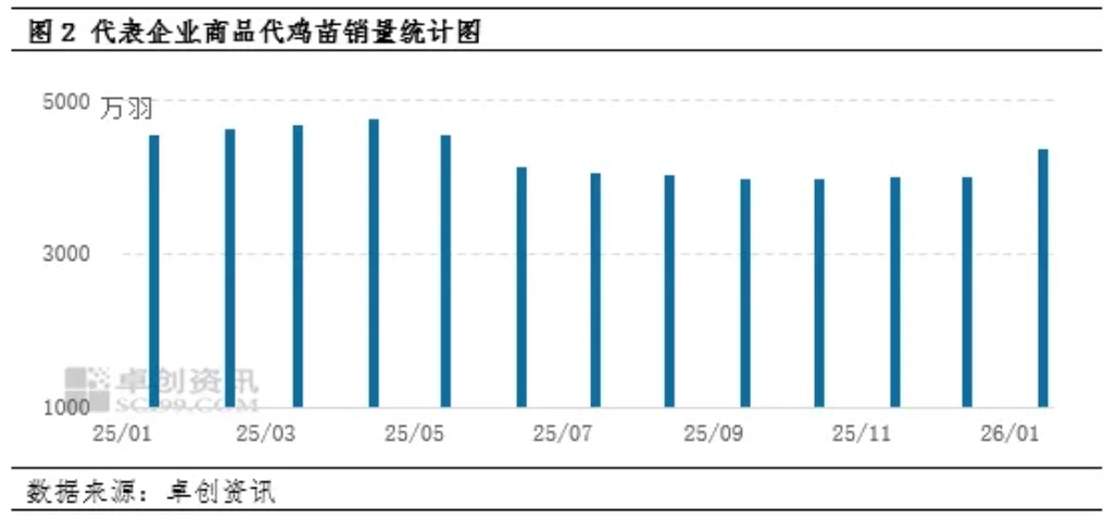 1月份随着蛋鸡养殖扭亏为盈,叠加养殖企业及青年鸡场多看好未来行情,补栏积极性均明显提升。尤其在空栏率较高的区域,出现了较为集中的恢复性补栏现象,进一步带动了鸡苗市场的活跃度。种鸡企业反映,鸡苗订单状况明显好转,销售节奏加快。根据卓创资讯监测的18家代表企业商品代鸡苗总销量情况来看,1月鸡苗总销量约为4322万羽,环比增幅9.17%,销量提升有力支撑了苗价的上涨。同时种鸡企业鸡苗订单多数排至3月中下旬,种蛋利用率多在60%-70%,整体市场需求呈现出持续向好的发展态势,为苗价提供了稳固的基本面支撑。