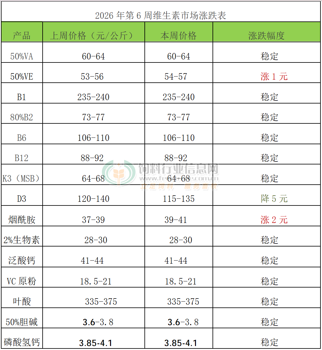 VA:本周VA市场报价60-64元/公斤。欧洲VA1000市场报价15-16欧元/公斤。10月28日市场称部分厂家报价提至70-72元/公斤。2026年1月6日新和成VA提价至70元/公斤。2026年1月15日市场称浙江医药VA提价至75元/公斤。