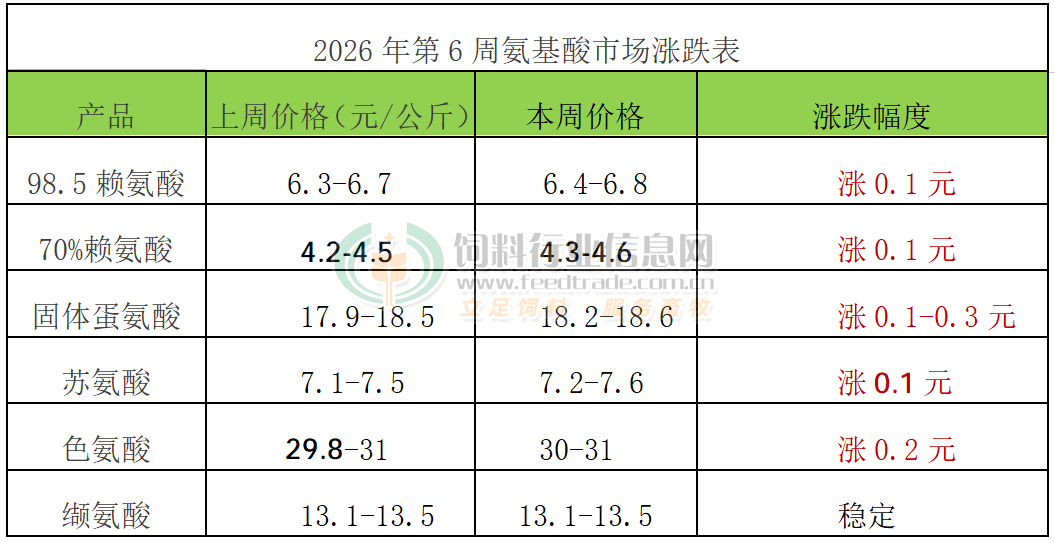 赖氨酸市场中,98%赖氨酸参考报价区间6.4-6.8元/公斤,70%赖氨酸参考报价区间4.3-4.6元/公斤。2025年12月,我国赖氨酸与赖氨酸盐及酯的出口量为9.8万吨,同比增0.4%,环比增8.4%。11月万里润达氨基酸生产线计划阶段性升级检修。1月28日星湖伊品98.5%赖氨酸上调150元/吨,70%赖氨酸上调200元/吨。2月2日市场称金玉锋98.5%赖氨酸报价6.5元/公斤,70%赖氨酸报价4.5元/公斤,出口较好,厂家挺价态度依存,市场稳中偏强运行。