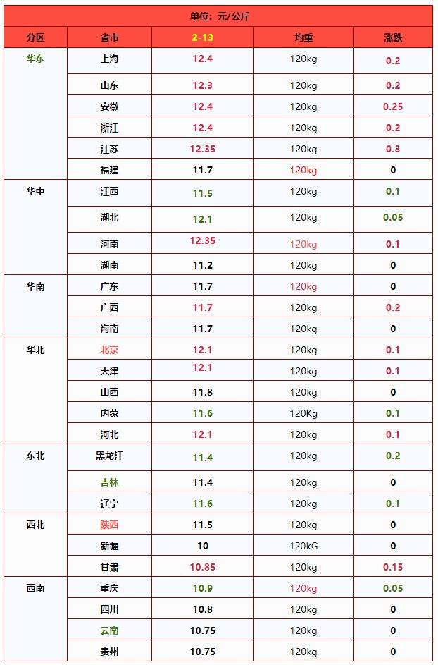 从最新消息了解,受供需变化,预计,2月13日,外三元标猪报价在11.52元/公斤,后市关注集团猪企出栏节奏的变化!