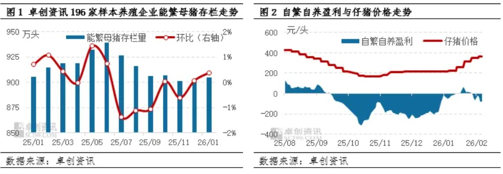 卓创资讯监测196家样本养殖企业1月能繁母猪存栏量环比微增。支撑能繁母猪存栏回升的主要因素有三点:一是1月养殖端仔猪补栏积极性明显提升,仔猪价格同步进入上行通道;截至1月底,卓创资讯监测全国7公斤仔猪月度交易均价为291.96元/头,环比上涨34.14%。二是养殖端亏损幅度显著缓解,截至1月底,自繁自养月度平均盈利为-6.34元/头,环比上涨96.57%,亏损大幅收窄。仔猪价格回暖叠加养殖亏损减少,明显削弱了市场淘汰能繁母猪的意愿。此外,北方部分区域养殖场仍有投产补栏动作,进一步对存栏形成多支撑。但1月国内部分区域局部猪病出现复发,造成部分能繁母猪存栏受损,对存栏增幅形成制约。因此,1月能繁母猪存栏虽环比增加,但整体增幅有限。