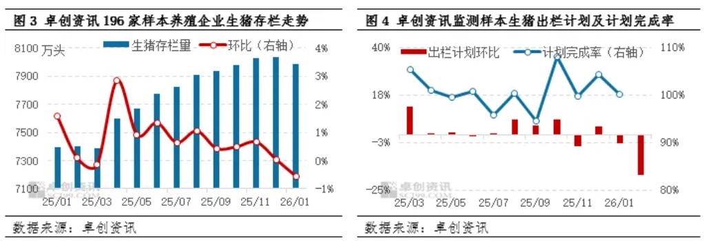 卓创资讯监测196家样本养殖企业1月生猪存栏量环比微减。一方面,生猪存栏与4个月前的能繁母猪变化相对应,而此前能繁母猪存栏已处于下滑态势,源头产能的缩减,为1月生猪存栏回落奠定了核心基础。另一方面,卓创资讯监测227家样本养殖企业数据显示,1月生猪出栏计划完成率为100.06%,养殖端整体小幅超额完成出栏计划,进一步推动生猪存栏量下降。不过受区域流通、场内生猪适宰情况及出栏安排等因素影响,国内部分区域养殖端1月份出栏计划执行不及预期,相应出栏量被迫延迟至2月份,这在一定程度上对冲了存栏下滑的幅度,使得 1月生猪存栏减量未进一步扩大。