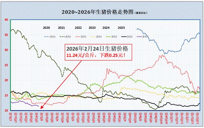 从数据分析,截至2026年2月24日,全国外三元瘦肉型标猪价格,出栏平均价在11.24元/公斤,相比前一日下降0.25元/公斤,相比春节前11.64元/公斤,下跌0.4元/公斤,年后猪价重心下移,全国南北地区,猪价呈现“一片绿”的局面!