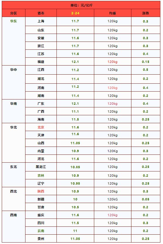 | 华南 | 广东省 | 11.36 | 11.60 | -2.07% | 元/KG |