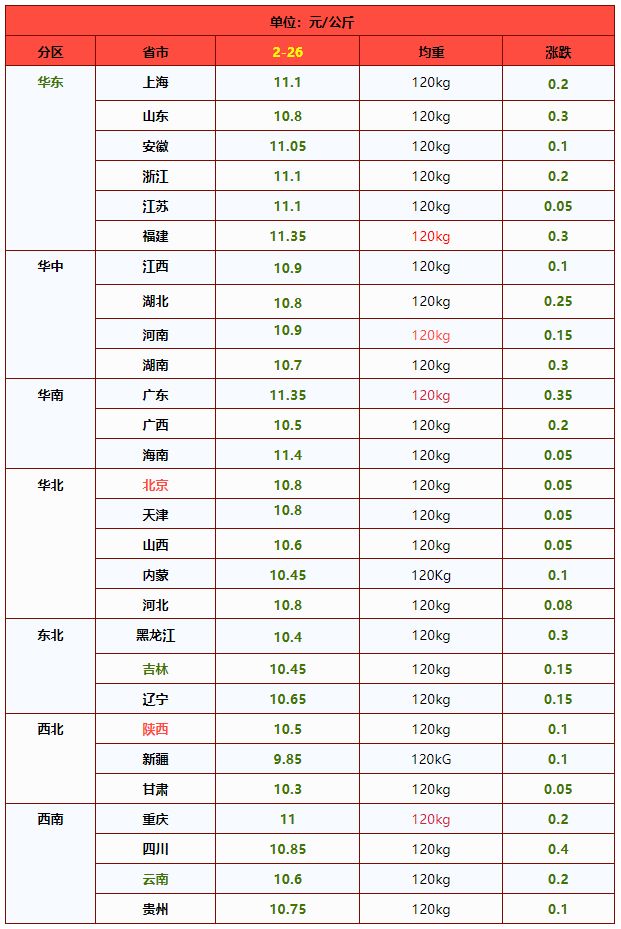 | 华北 | 北 京 | 10.90 | 11.19 | -2.59% | 元/KG |