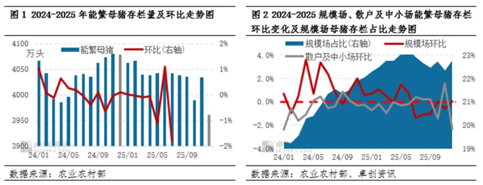 2025年末能繁母猪存栏下滑明显,但减产主体中散户居多推动规模化占比提升,产效提升或对冲母猪减少的影响。2026年产能仍过剩或导致养殖盈利明显缩水,但对中小养殖户来说,也带来大猪供应缺口扩大的契机,未来饲料成本或维持低位,而压栏大猪或减亏增利,成为中小户提供穿越亏损周期的利器。