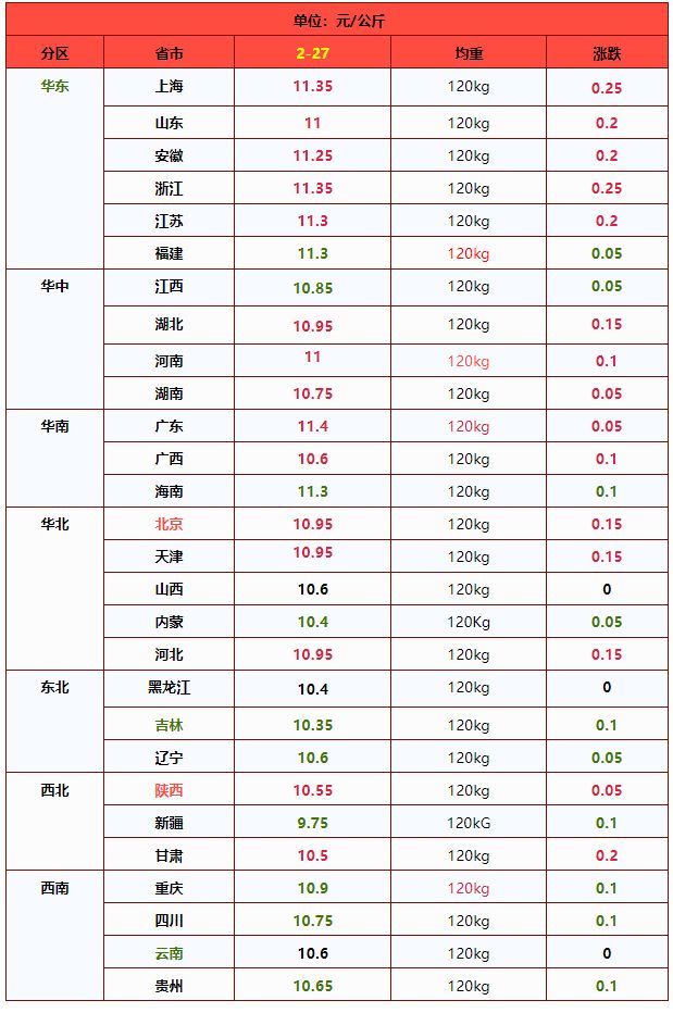 | 华北 | 北 京 | 11.00 | 10.90 | 0.92% | 元/KG |