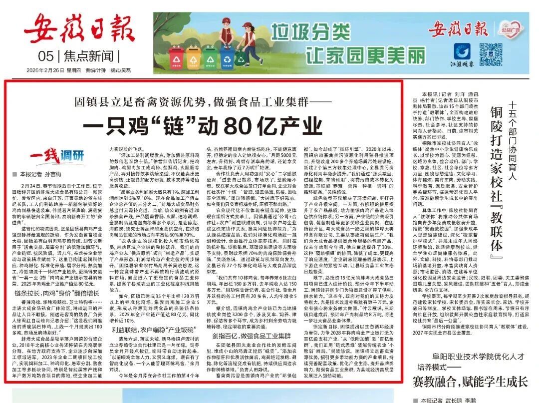 锚定新目标,固镇提出以生态循环经济为牵引,力争2028年将肉鸡全产业链打造为百亿级支柱产业。“从‘低附加值’到‘百亿集群’,我们正用‘链式思维’破解传统农业‘小散弱’困局。”吴晓悠说。固镇将立足畜禽资源优势,招引更多带动能力强的产业项目,持续完善配套政策、优化产业生态、提升品牌影响力,做强食品工业集群,为县域经济高质量发展注入强劲动能。