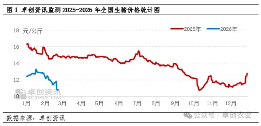 【导语】 2026年2月,生猪供应整体充沛,节前需求未能达到市场预期,节后需求进入传统消费淡季,供应大于需求的局面使得猪价不断承压下滑。进入3月,随着产能释放,生猪供应更加宽松,并且需求端因为家庭需求恢复缓慢,提振作用有限,卓创资讯预计3月猪价下行压力仍在。