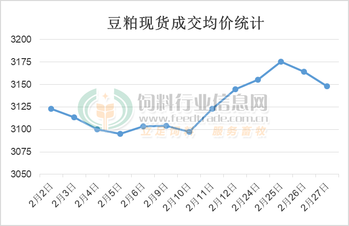 美盘大豆价格上涨带动进口大豆价格跟随上行,但因国内大豆供应充足,且饲料养殖企业在春节前大量备货后继续拿货需求有限,油厂豆粕成交转为清淡后库存处于中等偏高水平,供应宽松令豆粕价格出现小幅反弹后回落行情。据饲料行业网豆粕分析师统计,豆粕价格在2月处于震荡偏强运行后回调走势,最终2月主要油厂43%蛋白豆粕成交均价3126.73元/吨,较1月均价下跌41元/吨,下行幅度为1.3%。具体分析如下: