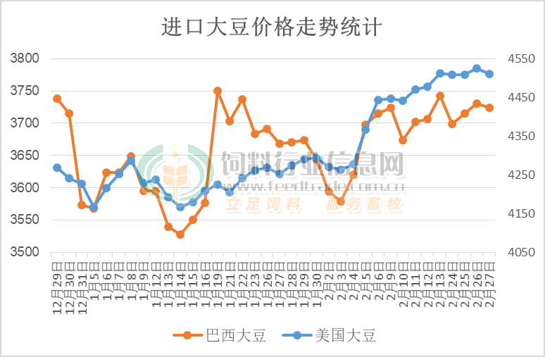 受美盘大豆价格一路上行影响,进口大豆价格连续偏强上行,成本端对豆粕市场提供明显的支撑。其中进口美国大豆价格涨幅明显,从月初4260元/吨上涨至4520元/吨,上涨260元/吨。巴西大豆价格亦出现上涨,特别是2月上旬上涨较明显,主要是洪涝灾害导致大豆收割进度放缓,随后出现偏强运行走势,从3580元/吨低位上涨至3740元/吨,上涨160元/吨。随着后期巴西大豆收割工作的持续,创纪录丰产的大豆将运送至港口进行装船运输,季节性压力凸显后继续上涨幅度受限。