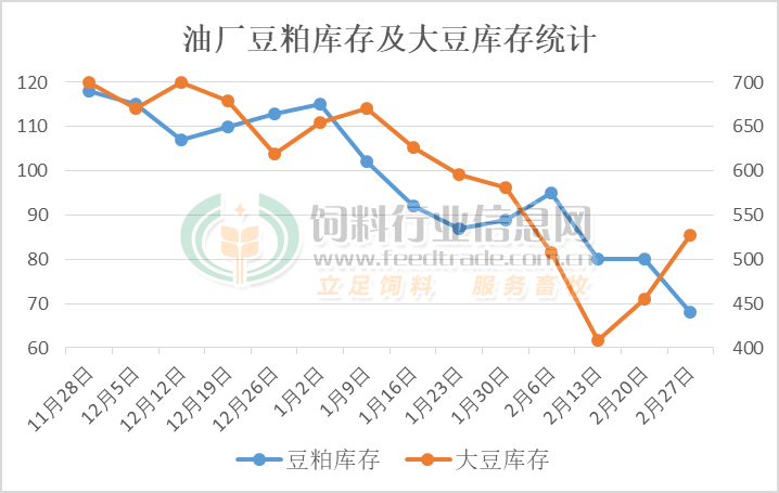 进入2月后不少油厂将在春节前提前停机放假,大豆压榨及豆粕产量均降至一年中的最低水平。而终端的饲料养殖企业也提前大量备货满足春节期间畜禽饲料生产需要,导致油厂豆粕库存不断减少。加之春节长假后油厂开机恢复缓慢,豆粕产量有限,而部分买家需提前前期采购的合同,豆粕库存持续下降。据国家粮食和物资储备数据中心监测显示,截止2月 26日,全国主要油厂豆粕库存68万吨,已经降至2025年6月下旬以来低位,不过比2025年同期多4万吨,较过去三年同期均值上升3万吨。