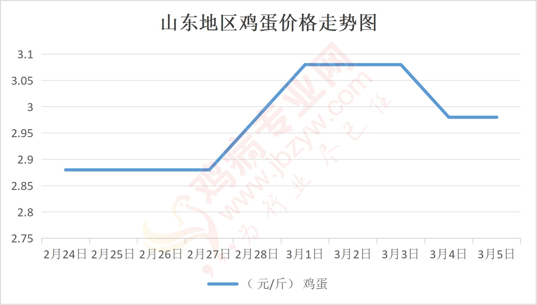 鸡病专业网消息:3月5日,山东地区莱阳鸡蛋3.05元/斤,稳;青岛鸡蛋3.05元/斤,稳;诸城鸡蛋3元/斤,稳;安丘鸡蛋2.9元/斤,稳;昌乐鸡蛋2.9元/斤,稳;寿光鸡蛋2.9元/斤,稳;昌邑鸡蛋2.9元/斤,稳;高密鸡蛋3元/斤,稳;青州鸡蛋2.9元/斤,稳;临朐鸡蛋2.9元/斤,稳;莱州鸡蛋3.05元/斤,稳;威海鸡蛋3.05元/斤,稳;临沭鸡蛋2.9元/斤,稳;沂水鸡蛋2.9元/斤,稳;沂南鸡蛋2.9元/斤,稳;莒南鸡蛋2.9元/斤,稳;兰陵县鸡蛋2.9元/斤,稳;日照鸡蛋2.9元/斤,稳;莒县鸡蛋2.9元/斤,稳;日照辛萁商贸鸡蛋2.9元/斤,稳;泗水鸡蛋价格87元/30斤,稳;济宁、汶上鸡蛋价格87元/30斤,稳;梁山、东平红蛋价格87元/30斤,稳;枣庄滕州地区鸡蛋混码主流到户87元/30斤,稳;泰安地区新泰鸡蛋价格87元/30斤,稳;菏泽地区曹县主流到户87元/30斤,稳;成武鸡蛋价格87元/30斤,稳;单县到户87元/30斤,稳;聊城莘县86元/30斤,稳;莱芜鸡蛋130元/45斤,稳;济南鸡蛋130元/45斤,稳;德州鸡蛋114元/40斤,稳;滨州鸡蛋114元/40斤,稳。