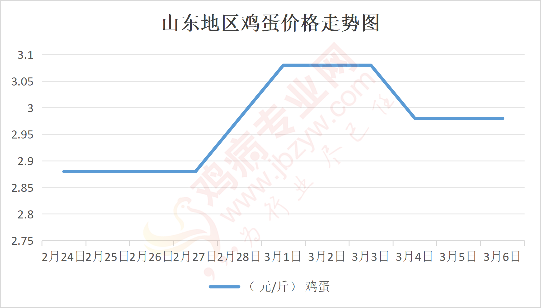 鸡病专业网消息:3月6日,山东地区莱阳鸡蛋3.05元/斤,稳;青岛鸡蛋3.05元/斤,稳;诸城鸡蛋3元/斤,稳;安丘鸡蛋2.9元/斤,稳;昌乐鸡蛋2.9元/斤,稳;寿光鸡蛋2.9元/斤,稳;昌邑鸡蛋2.9元/斤,稳;高密鸡蛋3元/斤,稳;青州鸡蛋2.9元/斤,稳;临朐鸡蛋2.9元/斤,稳;莱州鸡蛋3.05元/斤,稳;威海鸡蛋3.05元/斤,稳;临沭鸡蛋2.9元/斤,稳;沂水鸡蛋2.9元/斤,稳;沂南鸡蛋2.9元/斤,稳;莒南鸡蛋2.9元/斤,稳;兰陵县鸡蛋2.9元/斤,稳;日照鸡蛋2.9元/斤,稳;莒县鸡蛋2.9元/斤,稳;日照辛萁商贸鸡蛋2.9元/斤,稳;泗水鸡蛋价格87元/30斤,稳;济宁、汶上鸡蛋价格87元/30斤,稳;梁山、东平红蛋价格87元/30斤,稳;枣庄滕州地区鸡蛋混码主流到户87元/30斤,稳;泰安地区新泰鸡蛋价格87元/30斤,稳;菏泽地区曹县主流到户87元/30斤,稳;成武鸡蛋价格87元/30斤,稳;单县到户87元/30斤,稳;聊城莘县86元/30斤,稳;莱芜鸡蛋130元/45斤,稳;济南鸡蛋130元/45斤,稳;德州鸡蛋114元/40斤,稳;滨州鸡蛋114元/40斤,稳。