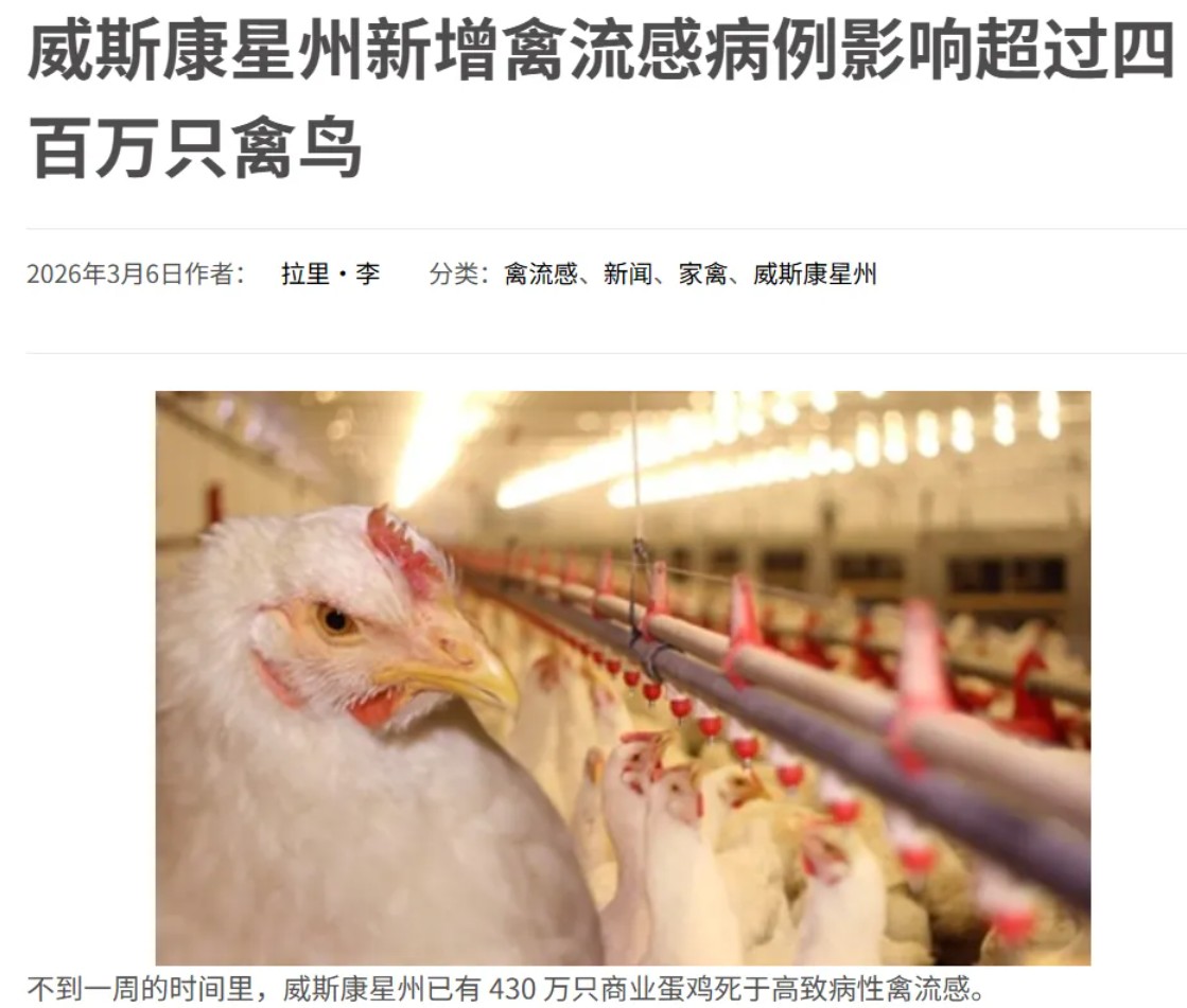 美国威斯康星州一周内超430万羽蛋鸡感染高致病性禽流感,近期杰斐逊县、沃尔沃思县新增病例分别致160万、140万羽蛋鸡受影响,病毒由野生候鸟传播且对鸡群致命。