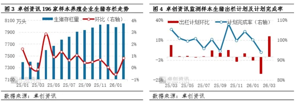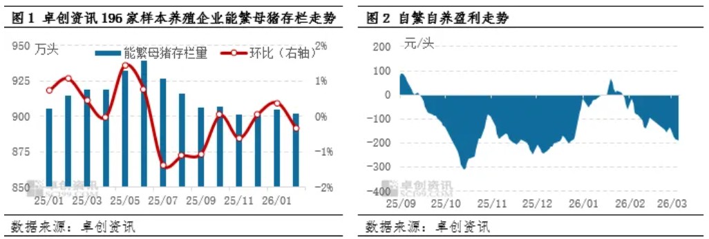 2月在养殖深度亏损影响下,行业去产能意愿提升,能繁母猪存栏由增转降。受消费偏弱、出栏节奏放缓影响,生猪存栏由降转增,猪源被动积压。展望3月,预计养殖端亏损持续,能繁母猪存栏或延续下滑,产能去化稳步推进;而受猪源基数充足、出栏偏慢支撑,生猪存栏或小幅增加,两大指标分化态势仍将延续。