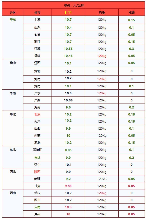 | 华南 | 广东省 | 10.52 | 10.51 | 0.10% | 元/KG |