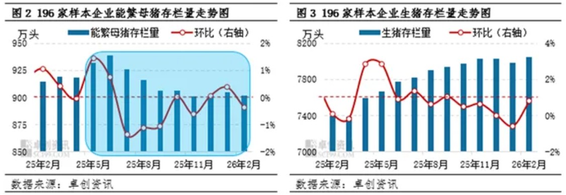 而这一局面在3月仍在延续,前期能繁母猪存栏相对高位,如同埋下了一颗供应过剩的种子,支撑各阶段猪源接续充足。即便养殖端上调出栏计划,出栏节奏也将偏慢,被迫压栏现象仍会普遍存在。3月底生猪存栏量大概率再迎增量,供大于求的市场格局进一步固化,仿佛是一个无法打破的恶性循环。