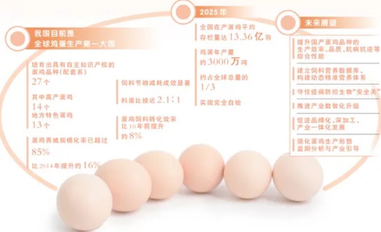 “过去鸡蛋在食品消费中处于补充地位,市场供给有限,日常吃蛋都要精打细算;后来得益于蛋鸡养殖和饲料工业的快速发展,鸡蛋成为老百姓餐桌上不可或缺的营养食材。”中国农业科学院北京畜牧兽医研究所所长、国家蛋鸡产业技术体系首席科学家张军民介绍,我国是全球鸡蛋生产第一大国,产量与规模长期稳居世界首位,实现完全自给。