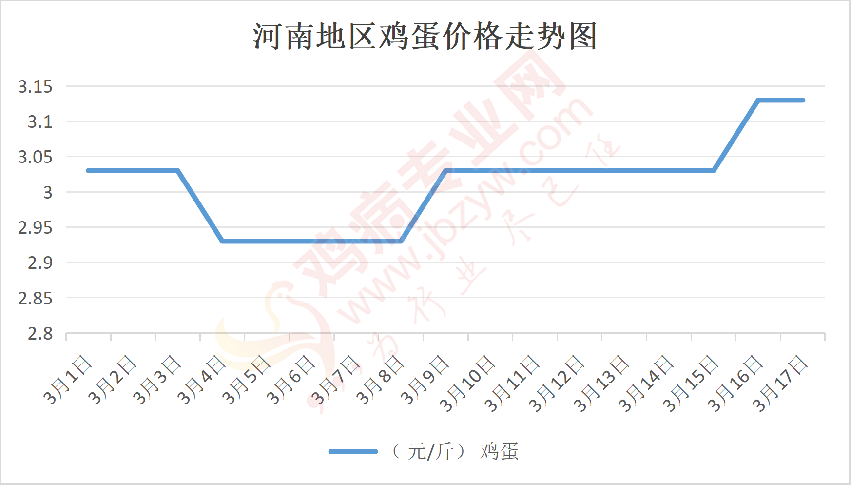 鸡病专业网消息:3月17日,河南郑州鸡蛋3.15元/斤,稳;新密鸡蛋3.15元/斤,稳;荥阳鸡蛋3.15元/斤,稳;中牟鸡蛋3.15元/斤,稳;周口鸡蛋3.1元/斤,稳;商丘鸡蛋93元/30斤,稳;鹤壁鸡蛋3.15元/斤,稳;汝州鸡蛋3.1元/斤,稳;开封鸡蛋93元/30斤,稳;漯河鸡蛋3.1元/斤,稳;漯河临颍鸡蛋3.1元/斤,稳;许昌鸡蛋3.1元/斤,稳;南阳鸡蛋3.1元/斤,稳;南阳邓州鸡蛋3.1元/斤,稳;新乡鸡蛋3.1元/斤,稳;安阳鸡蛋3.1元/斤,稳;新郑鸡蛋3.15元/斤,稳;登封鸡蛋3.15元/斤,稳;平顶山鸡蛋3.1元/斤,稳;驻马店鸡蛋3.1元/斤,稳;三门峡鸡蛋3.1元/斤,稳;焦作鸡蛋3.1元/斤,稳;信阳鸡蛋3.1元/斤,稳;濮阳鸡蛋3.1元/斤,稳。