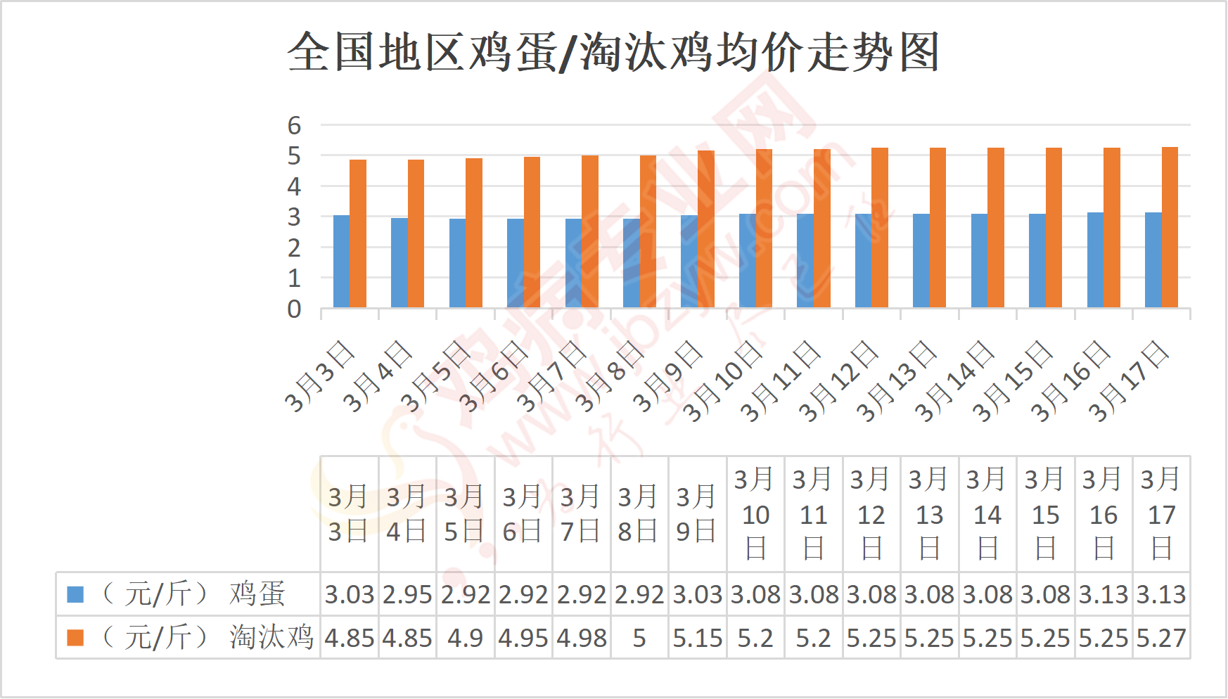 安徽地区:蚌埠鸡蛋3.1-3.17元/斤,与昨日相比持平,淘汰鸡5.4元/斤;