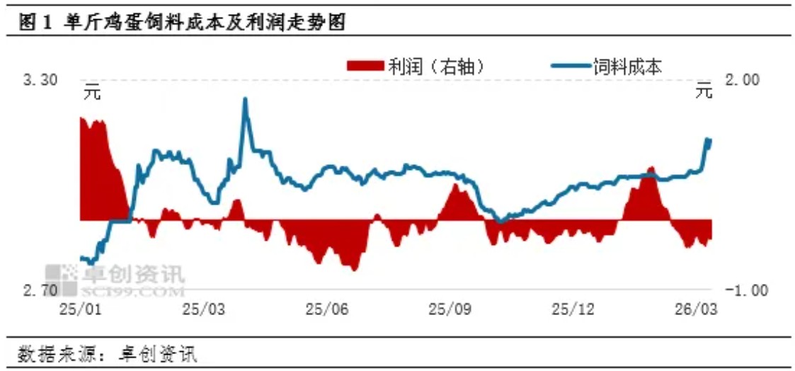 成本传导:饲料原料价格上涨已直接推高养殖成本,截至3月第二周,单斤鸡蛋饲料成本升至3.13元,而主产区鸡蛋均价虽于3月16日涨至3.16元/斤,但前期蛋价集中低于3.10元/斤,远低于综合养殖成本线,养殖端普遍陷入亏损。成本支撑与情绪带动鸡蛋价格缓步上涨,为淡季提供了相对坚实的底部支撑,也在一定程度上限制了蛋价的下行空间。
