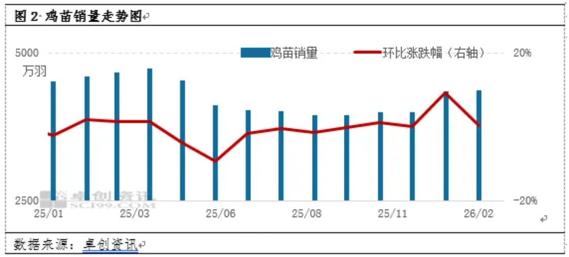 蛋鸡产能仍处高位,2月全国在产蛋鸡存栏量小幅增长,叠加主产蛋鸡(120-450日龄)占比持续上升,意味着短期大码鸡蛋供应仍将宽裕。存栏周期正处转折初期,2025年下半年蛋鸡养殖延续性亏损,补栏量持续偏低——6-10月鸡苗销量回落,对应2026年5月前新增开产压力有限;2024年9月至2025年4月的高补栏产能将在2026年下半年逐步出清。目前来看,供应压力最大的时间窗口已过,但由于存栏下行节奏偏缓,鸡蛋价格仍处缓慢抬升过程中。供应端正从“高压”向“边际缓解”过渡,但彻底扭转尚需时间。