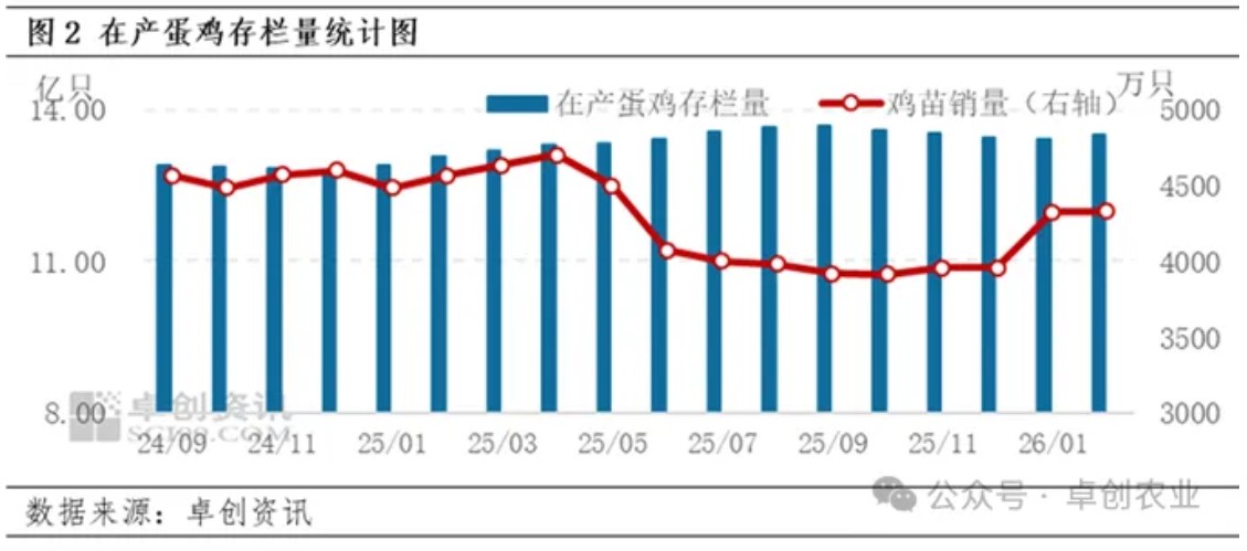 存栏预期高位微降:3月新开产蛋鸡供应或环比微涨,但老母鸡出栏量或较2月明显增加,因此3月在产蛋鸡存栏量或高位微降,3月鸡蛋供应量或降幅有限,仍较充足。