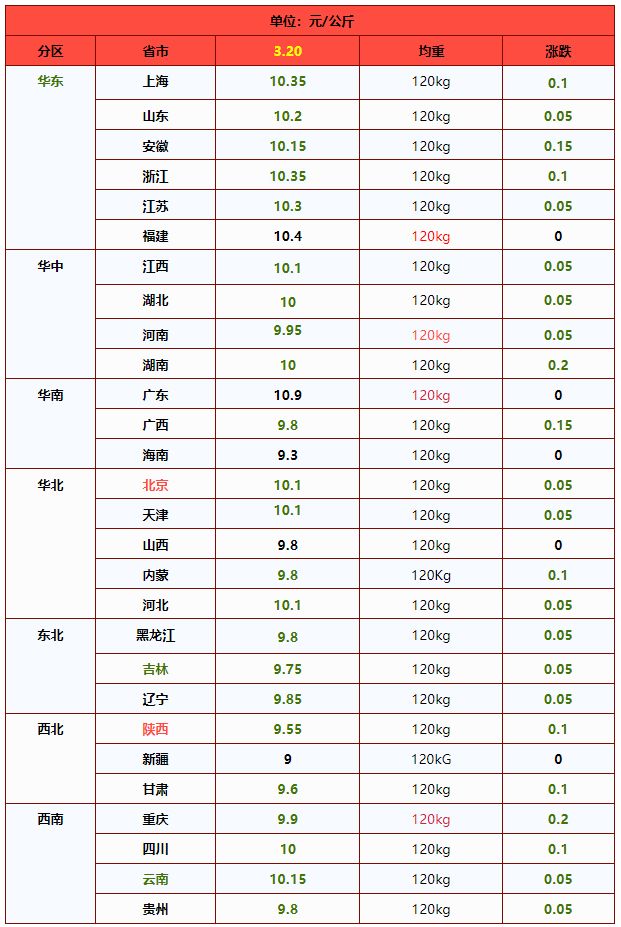 | 华南 | 广东省 | 10.00 | 9.95 | 0.50% | 元/KG |