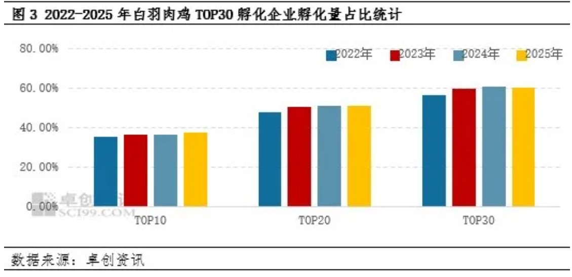 根据汇总数据显示,分别从TOP10、TOP20和TOP30企业维度来看,2025年TOP10阶段企业的孵化量占比较2024年提升,其他阶段的企业孵化量占比同比略降。从TOP30企业维度来看,2025年其孵化量占比达60.21%,和2024年相比降低0.57个百分点;TOP20企业鸡苗出苗量占比达50.76%,较2024年下降0.01个百分点;TOP10企业出苗量占比为37.29%,较2024年上升0.89%。首先,TOP10企业多为一条龙企业,在2025年屠宰量多有增量操作,其配套孵化量增加;其次,TOP10企业在品种选择方面趋向于多元化,在引种品种养殖成本不断提升、增量受限的情况下,部分TOP10企业通过选择国产品种进行产能补充,使得其总出苗量同比增速加快,占比提升;最后TOP11-30的企业中多为单环节企业,这部分企业为追求销售高价鸡苗,多选择引种品种,由于引种品种的祖代种鸡场单批次供种能力有限,抑制了这部分企业的产能扩张步伐,因此其占比较2024年略降。