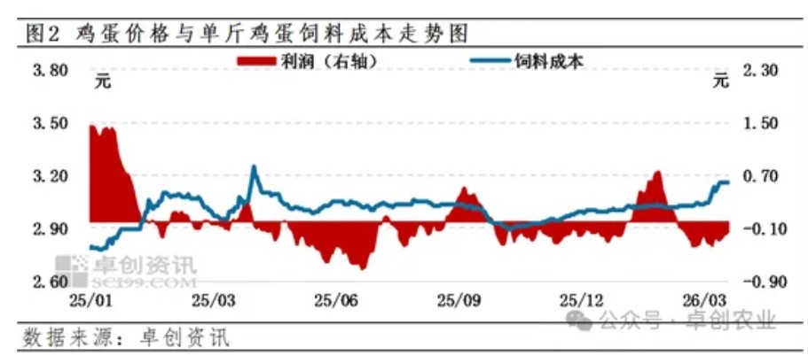 而受鸡蛋价格低位调整、饲料原料价格上涨的共同影响,蛋鸡养殖利润不佳,3月份暂处小幅亏损阶段。截至3月18日,单斤鸡蛋日度毛利润为-0.19元,3月月均毛利润为-0.27元,较2月月均毛利润降低0.23元,较去年同期降低0.31元。蛋鸡养殖暂处亏损阶段,且后期蛋价上涨趋势不明朗,养殖单位饲养积极性较为保守。