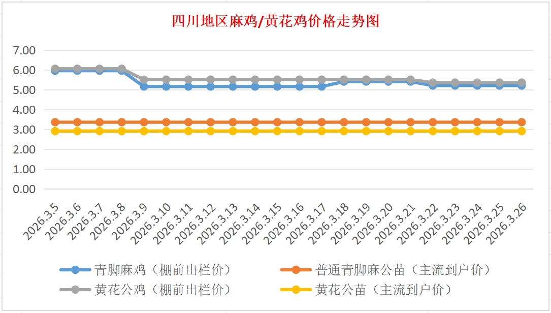 黄花公苗:价格稳定,主流到户价2.60-3.20元/羽,稳。