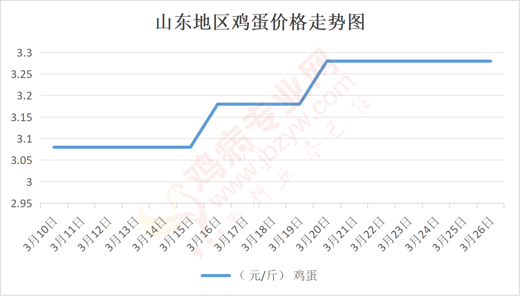 鸡病专业网消息:3月26日,山东地区莱阳鸡蛋3.3元/斤,稳;青岛鸡蛋3.3元/斤,稳;诸城鸡蛋3.35元/斤,稳;安丘鸡蛋3.2元/斤,稳;昌乐鸡蛋3.2元/斤,稳;寿光鸡蛋3.2元/斤,稳;昌邑鸡蛋3.2元/斤,稳;高密鸡蛋3.35元/斤,稳;青州鸡蛋3.2元/斤,稳;临朐鸡蛋3.2元/斤,稳;莱州鸡蛋3.3元/斤,稳;威海鸡蛋3.3元/斤,稳;临沭鸡蛋3.2元/斤,稳;沂水鸡蛋3.2元/斤,稳;沂南鸡蛋3.2元/斤,稳;莒南鸡蛋3.2元/斤,稳;兰陵县鸡蛋3.2元/斤,稳;日照鸡蛋3.2元/斤,稳;莒县鸡蛋3.2元/斤,稳;日照辛萁商贸鸡蛋3.2元/斤,稳;泗水鸡蛋价格96元/30斤,稳;济宁、汶上鸡蛋价格96元/30斤,稳;梁山、东平红蛋价格96元/30斤,稳;枣庄滕州地区鸡蛋混码主流到户97元/30斤,稳;泰安地区新泰鸡蛋价格96元/30斤,稳;菏泽地区曹县主流到户96元/30斤,稳;成武鸡蛋价格96元/30斤,稳;单县到户96元/30斤,稳;聊城莘县95元/30斤,稳;莱芜鸡蛋144元/45斤,稳;济南鸡蛋144元/45斤,稳;德州鸡蛋126元/40斤,稳;滨州鸡蛋126元/40斤,稳。