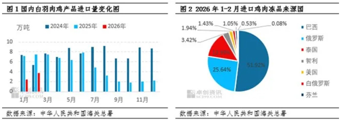 2026年1-2月鸡肉进口量逐月攀升,总量同比降幅近6成