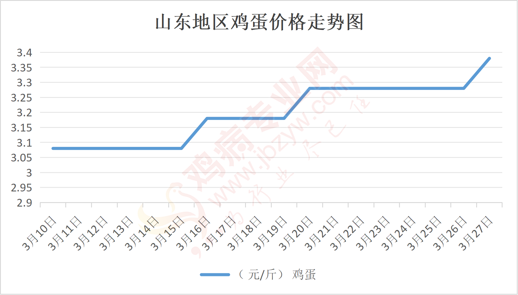 鸡病专业网消息:3月27日,山东地区莱阳鸡蛋3.45元/斤,涨;青岛鸡蛋3.45元/斤,涨;诸城鸡蛋3.4元/斤,涨;安丘鸡蛋3.3元/斤,涨;昌乐鸡蛋3.3元/斤,涨;寿光鸡蛋3.3元/斤,涨;昌邑鸡蛋3.3元/斤,涨;高密鸡蛋3.4元/斤,涨;青州鸡蛋3.3元/斤,涨;临朐鸡蛋3.3元/斤,涨;莱州鸡蛋3.45元/斤,涨;威海鸡蛋3.45元/斤,涨;临沭鸡蛋3.3元/斤,涨;沂水鸡蛋3.3元/斤,涨;沂南鸡蛋3.3元/斤,涨;莒南鸡蛋3.3元/斤,涨;兰陵县鸡蛋3.3元/斤,涨;日照鸡蛋3.3元/斤,涨;莒县鸡蛋3.3元/斤,涨;日照辛萁商贸鸡蛋3.3元/斤,涨;泗水鸡蛋价格99元/30斤,涨;济宁、汶上鸡蛋价格99元/30斤,涨;梁山、东平红蛋价格99元/30斤,涨;枣庄滕州地区鸡蛋混码主流到户100元/30斤,涨;泰安地区新泰鸡蛋价格99元/30斤,涨;菏泽地区曹县主流到户99元/30斤,涨;成武鸡蛋价格99元/30斤,涨;单县到户99元/30斤,涨;聊城莘县98元/30斤,涨;莱芜鸡蛋148元/45斤,涨;济南鸡蛋148元/45斤,涨;德州鸡蛋130元/40斤,涨;滨州鸡蛋130元/40斤,涨。