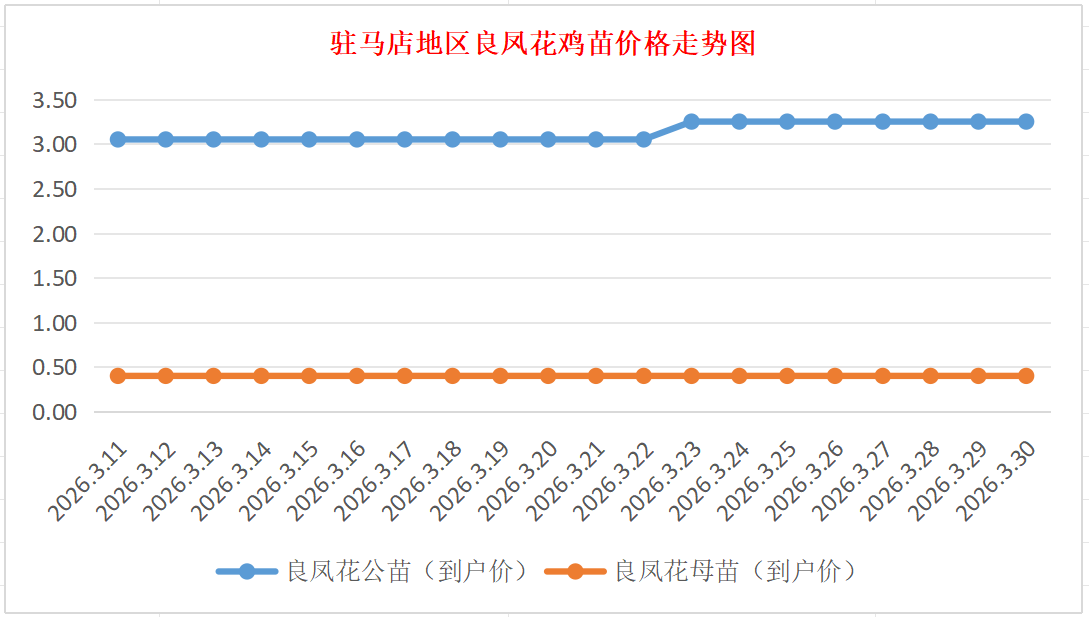 良凤花鸡苗:价格稳定,公苗到户价3.00-3.50元/羽,母苗到户价0.30-0.50元/羽,稳。