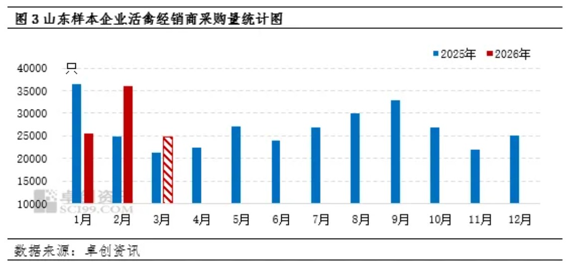养殖收入方面,3月青脚麻鸡市场呈现供需双降的基本面态势,假期结束后的需求降幅大于供应降幅,毛鸡收入承压下行。2025年12月样本企业在产种鸡存栏减少,企业种蛋上孵量下降,导致1月鸡苗供应量环比减少,根据卓创资讯数据监测结合养殖周期推算,3月毛鸡社会养殖量由560万只减少至390万只左右,环比降幅30.36%,毛鸡供应减少对养殖收入存利多支撑,但月内需求面降幅相对较大,具体来看,3月处春节假期之后,伴随开工开学,家庭消费及餐饮渠道需求均有回落,叠加其他黄羽快大类品种价格处于低位水平,间接利空麻鸡消费,终端需求不佳导致经销商采购意愿下降,根据卓创资讯样本数据监测,3月样本活禽经销商采购量预估为24700只,环比降幅31.39%,需求面表现对毛鸡交投存较强利空影响。