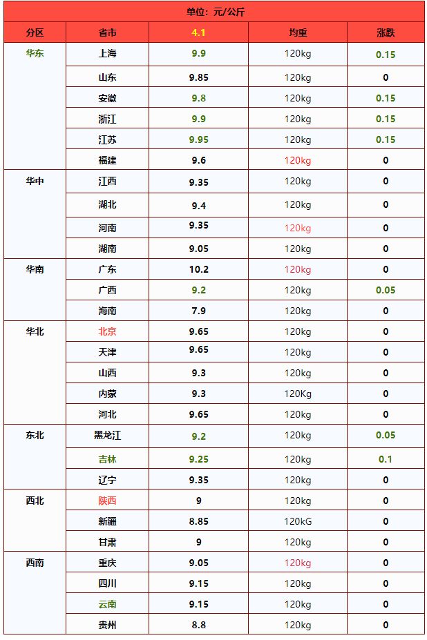 | 华南 | 广东省 | 10.09 | 10.09 | 0.06% | 元/KG |