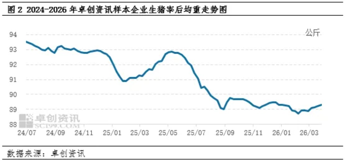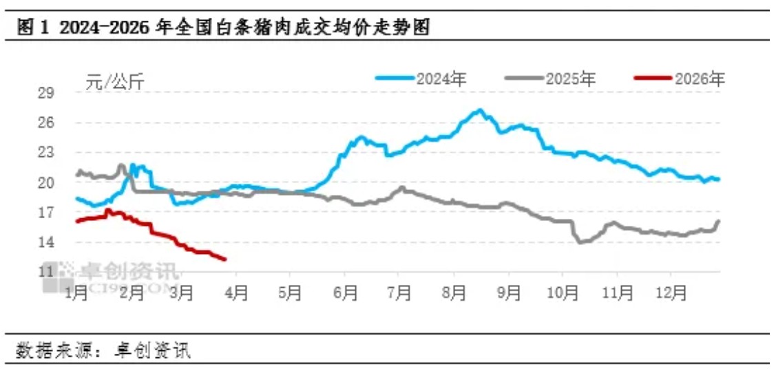 2026年春节过后终端需求陷入年内冰点,此时上游养殖端看空后市而积极出栏,白条猪肉市场供应过剩,价格呈持续下降的走势,至3月底价格已创多年来历史新低。4月份需求逐渐好转,供应紧张状况亦有缓解,价格或低位小涨,但幅度有限,长周期下仍处于偏低水平。