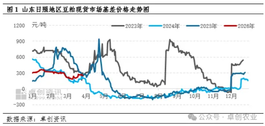 【导语】3月山东豆粕现货基差先扬后弱,受成本、供应等多重利多推动中旬走强,月末随情绪降温小幅松动。4月中上旬山东压榨企业停机减产,供应偏紧支撑基差持坚;下游需求受养殖盈利与替代原料压制,难有亮点。预计4月山东豆粕基差中上旬偏强、下旬承压,整体呈先强后弱格局。