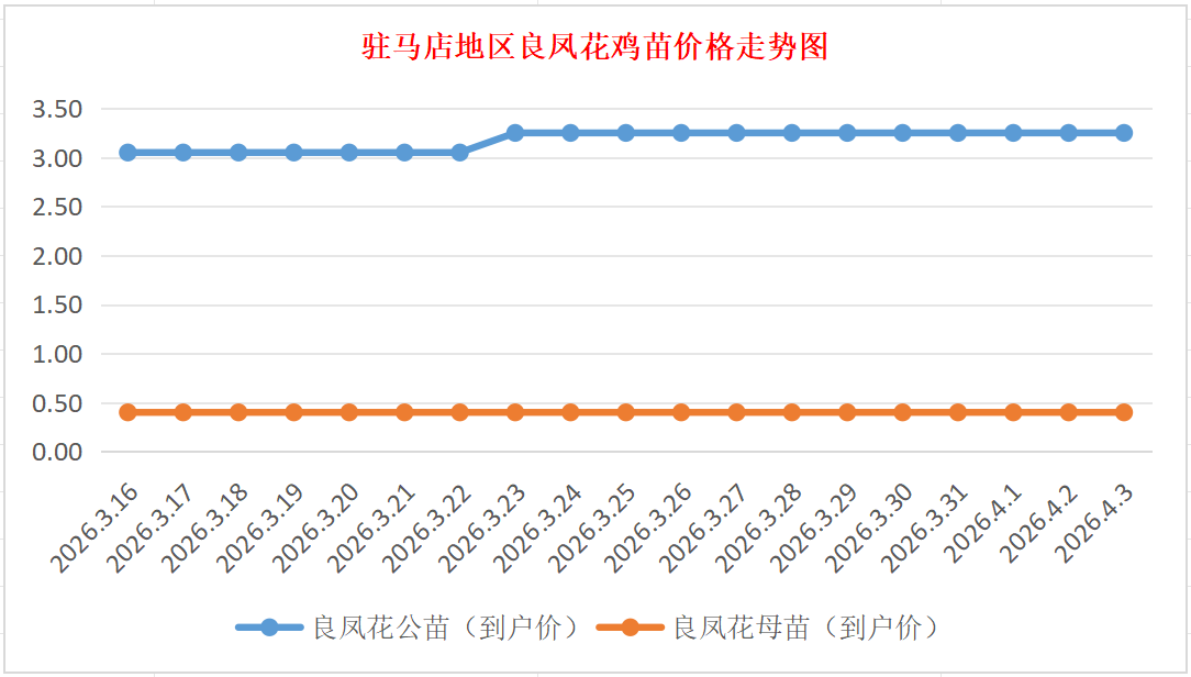 良凤花鸡苗:价格稳定,公苗到户价3.00-3.50元/羽,母苗到户价0.30-0.50元/羽,稳。