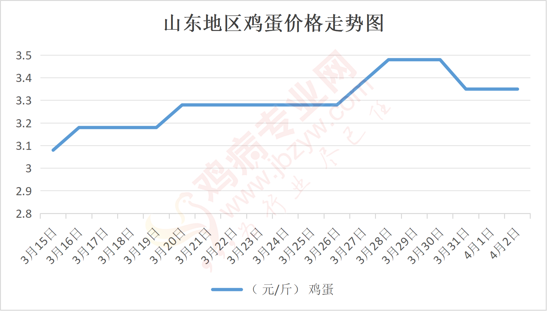 鸡病专业网消息:4月2日,山东地区莱阳鸡蛋3.35元/斤,稳;青岛鸡蛋3.35元/斤,稳;诸城鸡蛋3.4元/斤,稳;安丘鸡蛋3.25元/斤,稳;昌乐鸡蛋3.25元/斤,稳;寿光鸡蛋3.25元/斤,稳;昌邑鸡蛋3.25元/斤,稳;高密鸡蛋3.4元/斤,稳;青州鸡蛋3.25元/斤,稳;临朐鸡蛋3.25元/斤,稳;莱州鸡蛋3.35元/斤,稳;威海鸡蛋3.35元/斤,稳;临沭鸡蛋3.3元/斤,稳;沂水鸡蛋3.3元/斤,稳;沂南鸡蛋3.3元/斤,稳;莒南鸡蛋3.3元/斤,稳;兰陵县鸡蛋3.3元/斤,稳;日照鸡蛋3.3元/斤,稳;莒县鸡蛋3.3元/斤,稳;日照辛萁商贸鸡蛋3.3元/斤,稳;泗水鸡蛋价格96元/30斤,稳;济宁、汶上鸡蛋价格96元/30斤,稳;梁山、东平红蛋价格96元/30斤,稳;枣庄滕州地区鸡蛋混码主流到户98元/30斤,稳;泰安地区新泰鸡蛋价格96元/30斤,稳;菏泽地区曹县主流到户96元/30斤,稳;成武鸡蛋价格96元/30斤,稳;单县到户96元/30斤,稳;聊城莘县96元/30斤,稳;莱芜鸡蛋144元/45斤,稳;济南鸡蛋144元/45斤,稳;德州鸡蛋126元/40斤,稳;滨州鸡蛋126元/40斤,稳。