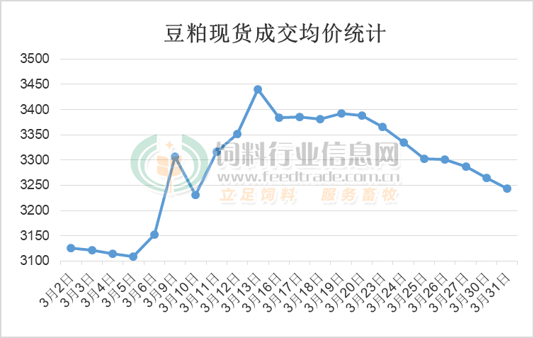 美盘大豆价格上涨且原油涨价后海运费上涨带动进口大豆价格跟随上行,叠加到港大豆数量下降后豆粕供应逐渐收紧,增强油厂对豆粕的挺价意愿后价格明显上行,即使中旬后成本有所回调且预期进口到港大豆数量陆续增加,豆粕价格才出现缓慢回调的趋势。据饲料行业网豆粕分析师统计,豆粕价格在3月处于偏强运行后缓慢回调走势,最终主要油厂43%蛋白豆粕成交均价3286.28元/吨,较2月均价上涨近160元/吨,上涨幅度为5.1%。具体分析如下: