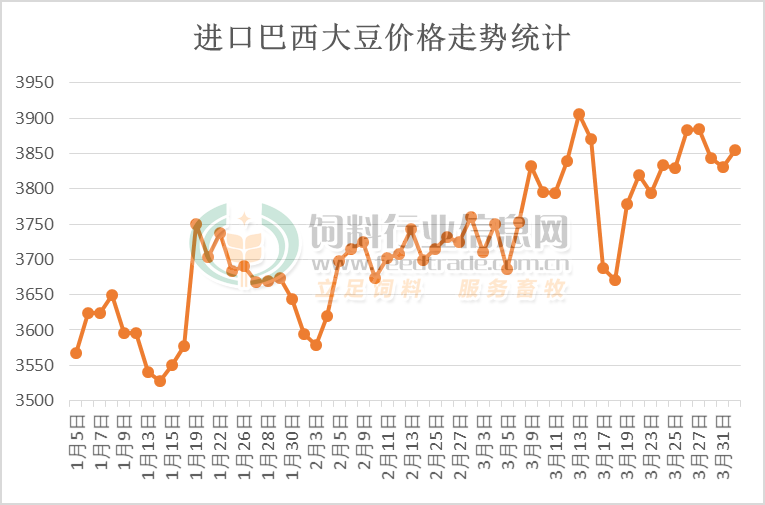 受巴西大豆产区不利于收割的天气导致大豆上市及出口缓慢,且中东战乱后原油价格上涨后海运费增加,并带动豆油等大宗产品上涨后对美盘大豆提供较强支撑,进口大豆成本跟随上行后增强油厂对豆粕的提价意愿。其中巴西大豆价格上涨明显,从3月上旬低点3690元/吨强势上涨至3900元/吨之上,短期涨幅超210元/吨,虽说在后期出现短暂回落,但继续处于震荡偏强的走势。预计后期到港的进口巴西大豆通关数量增多后用于压榨产生豆粕,供应紧张局面有所缓解后价格将出现偏弱走势。